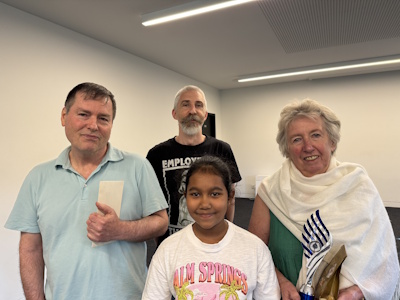 David wins the Championship and Olga (Qld) wins the PlateJithuni was awarded Best Youth Player in the PlateOur Prize winners: (L-R) Trevor (3rd), Naween (5th), Frank (3rd in Plate), David (Champion), Geoff (Joint High Word). In front, Jithuni as Best Youth Plate Player