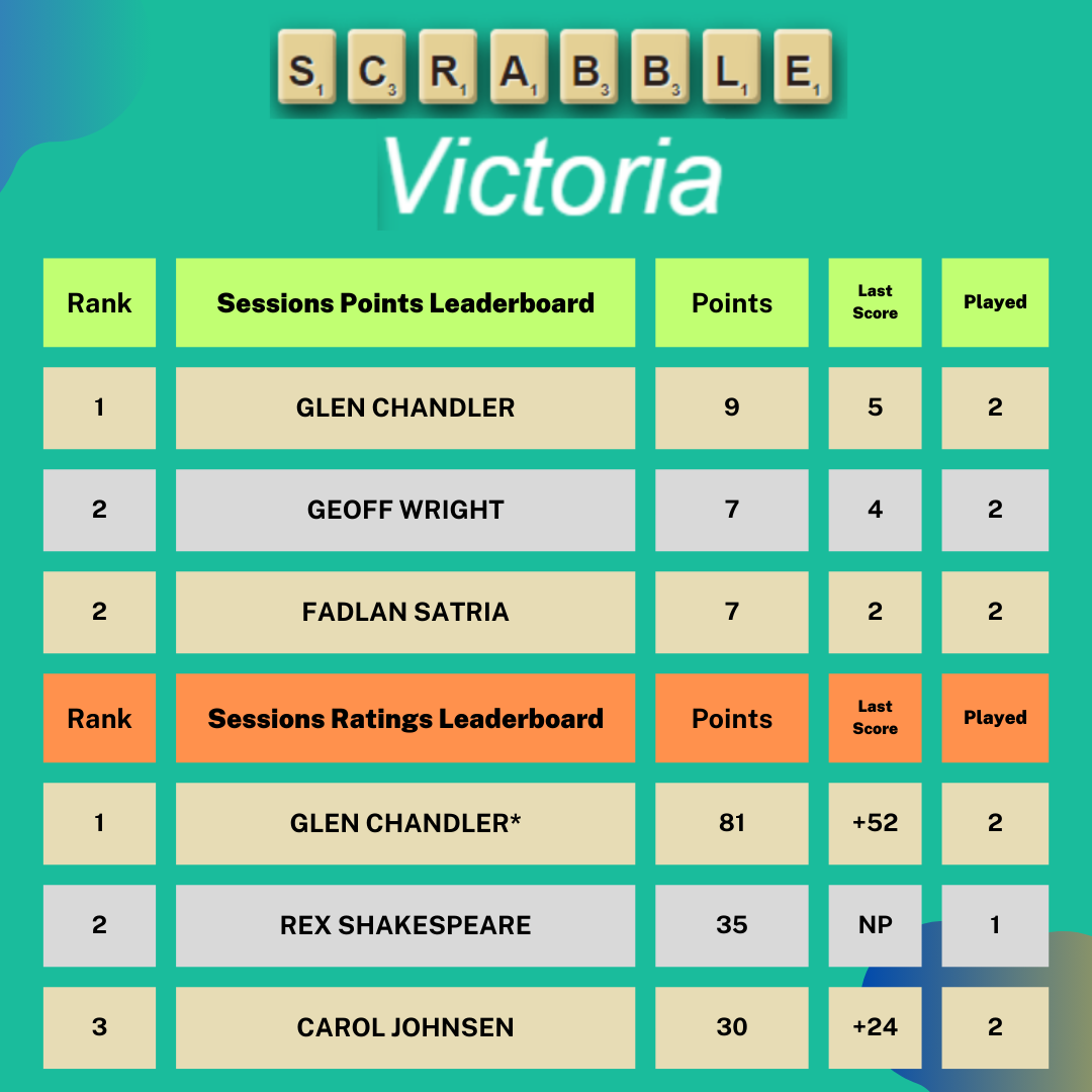 Geoff wins in AGeoff also took out High Word, Trevor scored the High Game, with Fadlan runner-up and Sumbul 3rdRob Y takes out B DivisionAdi and Rob H take out the minor places and prizesRandi made his Scrabble Victoria debut todayTrevor hits 572 for Highest Game of the Day!